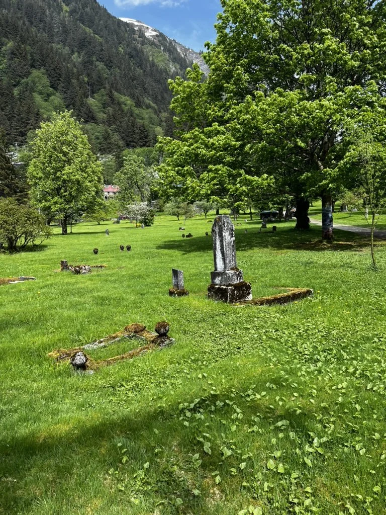 That is why on this day, I shook the tree leaves a bit harder when I heard someone actually want to know about us. About the proud family that still remains harvesting this land. You can see our layers from the rocks. From the wear and tear in the base of the family stone. From the proud obelisk contrasting the overcast sky. The mountains in the back remind us how small our layers are when compared to the wear and tear of time. Water does this. It cracks open the earth and weaves its way in. It pushes mountains. It creates valleys. It sustains the patch of land in front of my gravestone. It helps me commune with the next generation of my family that harvest its crops. They are the next layer of our story.